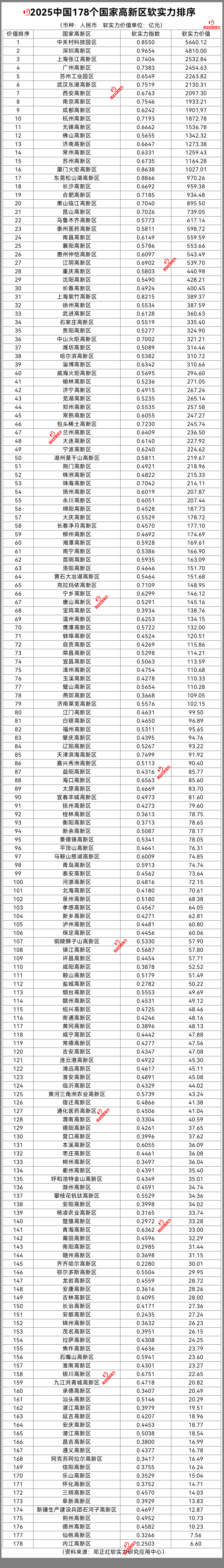 2025中国国家高新区软实力排行榜发布:总价值达5.9万亿元,中关村、深圳、张江位列前三。高新区以9.94%的增速引领产业升级,人工智能、量子信息等未来产业崭露头角,独角兽企业占比全国67%,正从技术跟随者向标准制定者跃迁。邓正红软实力根据国家高新区2024年经济运行和价值创造情况,同时结合国家高新区所在城市软实力水平,按照邓正红研创的软实力指数工具,对178个国家高新区的软实力从指数和价值两方面进行评估计算,发布2025中国国家高新区软实力排行榜,这是邓正红软实力连续第五年发布该榜单。榜单按照软实力价值从高到低对国家高新区排序,若软实力价值相同,则以软实力指数为依据。本年度国家高新区软实力价值总计59130.77亿元,增幅达9.94%;整体软实力指数均值为0.5188,较上年扩大0.19个百分点。国家高新区软实力强化与转化、创新势能释放与放大、价值创造效能提升取得重要进展。